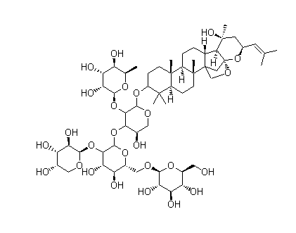 別名 酸棗仁皂苷 A ;酸棗仁皂甙A ;O-6-Deoxy-a-L-mannopyranosyl-(1(r)2)-O-[O-b-D-glucopyranosyl-(1(r)6)-O-[b-D-xylopyranosyl-(1(r)2)]-b-D-glucopyranosyl-(1(r)3)]-(3b,16b,23R)-16,23:16,30-diepoxy-20-hydroxydammar-24-en-3-yl-a-L-arabinopyranoside