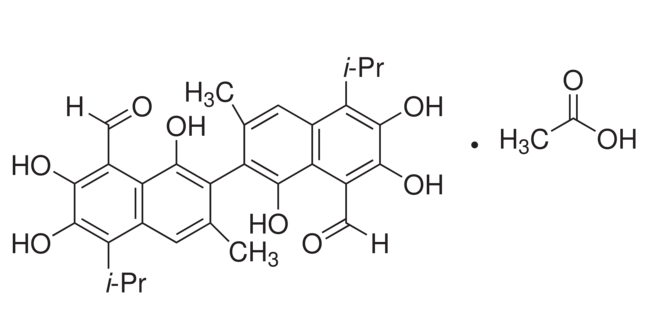 別名   醋酸棉酚;1,1',6,6',7,7'-Hexahydroxy-3,3'-dimethyl-5,5'-bis(1-methylethyl)[2,2'-binaphthalene]-8,8'-dicarboxaldehyde-acetic acid