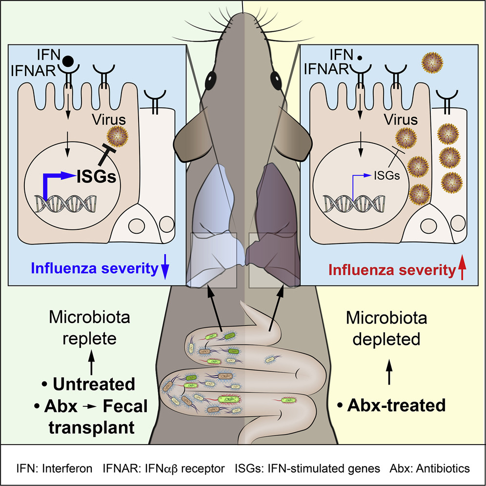 為了更進一步的證實腸道細菌會被抗生素“誤殺”。研究人員將接受抗生素投喂小鼠的腸道菌群恢復平衡后發(fā)現(xiàn),干擾素信號傳導不僅恢復正常,且重建了肺部對流感的抵抗力。