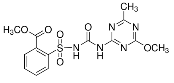 別名  甲磺隆 ;2-[3-(4-甲氧基-6-甲基-1,3,5-三嗪-2-)脲基磺酰基]苯甲酸甲酯,2-[(4-甲氧基-6-甲基-1,3,5-三嗪基-2-)脲基磺酰基]苯甲酸甲酯 ;