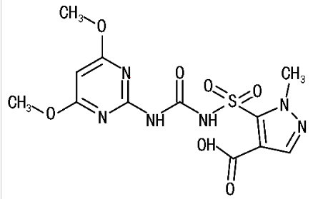 別名 吡嘧磺隆 ;草克星;5-(4,6-二甲氧基嘧啶-2-基氨基甲酰氨基磺?;?span>)-1-甲基吡唑-4-羧酸;5-((4,6-dimethoxypyrimidin-2-ylcarbamoyl)sulfamoyl)-1-methylpyrazole-4-carboxylic acid; 5-(((((4,6-dimethoxy-2-pyrimidinyl)amino)carbonyl)amino)sulfonyl)-1-methyl-1h-pyrazole-4-carboxylic acid
